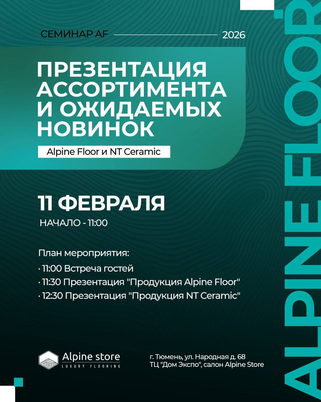 11 февраля в ДОМЭКСПО пройдёт презентация ассортимента и самых ожидаемых новинок от Alpine Floor и NT Ceramic — в обновлённом салоне Напольные покрытия | Керамогранит | Alpine store . Это встреча для тех, кто работает с интерьерами профессионально и для тех, кто хочет уверенно разбираться в напольных покрытиях.